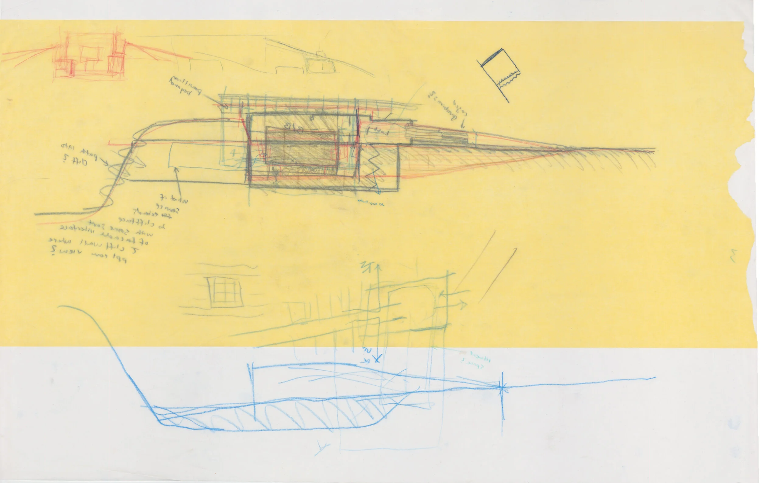 Through a series of physically-drawn conversations, a cruciform strategy was developed based on key moments of gathering and departure as movement around and to the theater were refined. Both section and plan explorations began addressing how revealing and veiling views, the intervention, and landscape elements could be approached.