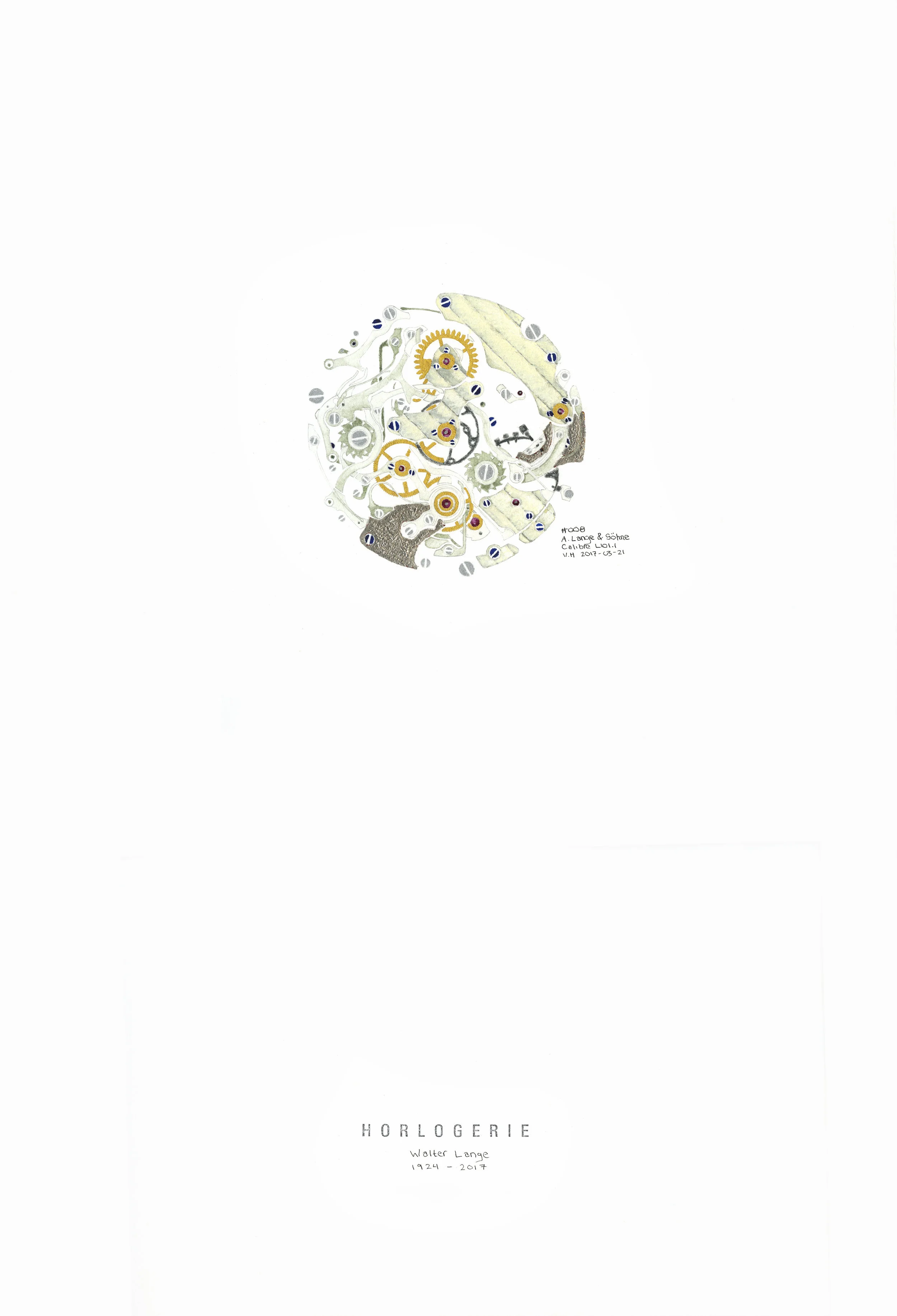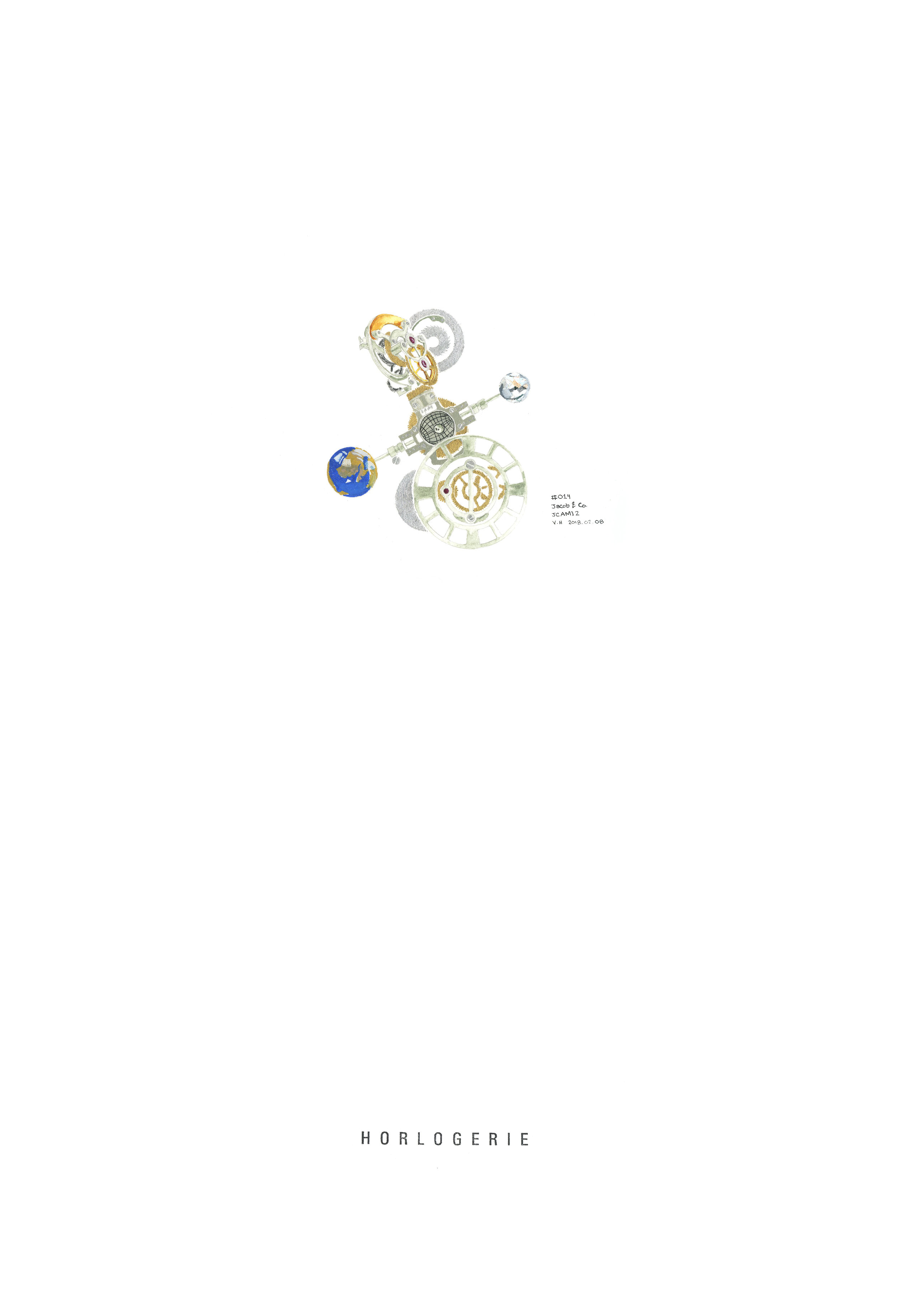The Horlogerie series consists of re-creations and re-imaginings of the inner mechanisms of watches. The series is inspired by a fascination with the complexities of the timepiece, the mostly hidden artistry and intricacies of an instrument meant to simply tell us the time of day. The face of the instrument, like the various theories and conceptions of time to which we have recourse in our daily lives, is deceptively simple; but our interaction with the watch, much like our often unconscious reliance on notions of time, is arguably at odds with what lies hidden underneath. These works explore this tension between surface and substrate, concept and underlying reality, through the use of mixed mediums in a single piece. The tension is drawn out by the juxtaposition of flattened and simplified details with more realistic three dimensional forms, and by the image’s placement, as if floating on the blank page.
